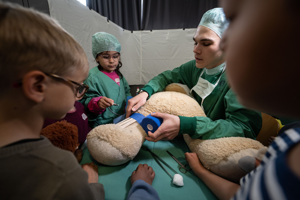 Das „Teddybär-Krankenhaus“ ist ein Projekt der Medizinstudierenden an der UMG. Sie wollen den Kindern auf diese Weise den Umgang mit Krankheit und den Kontakt mit Ärzt*innen spielerisch näher bringen und erleichtern. Wie in einem echten Krankenhaus wird geröntgt und operiert, eine Apotheke versorgt alle Patient*innen mit der nötigen Arznei. Schirmherr des Projekts ist Prof. Dr. Thomas Paul, Direktor der Klinik für Pädiatrische Kardiologie, Intensivmedizin und Neonatologie der UMG.