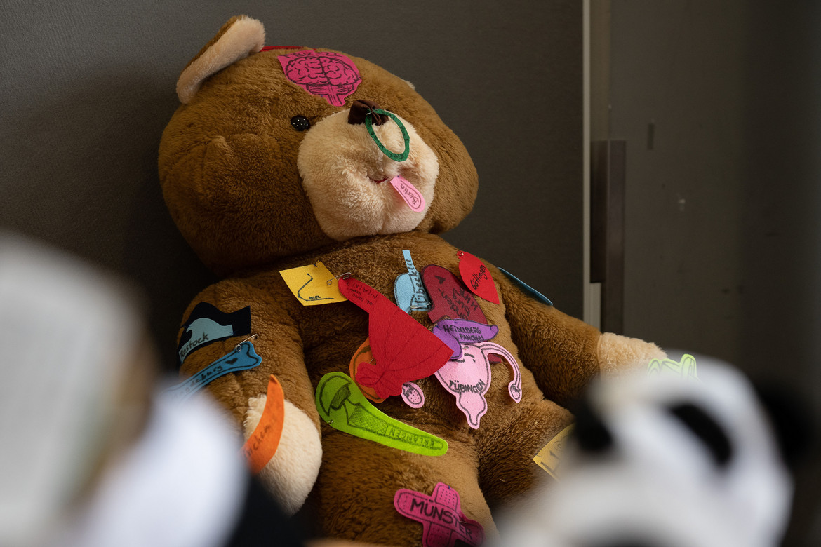 Etwa 40 Medizin- und Zahnmedizinstudierende untersuchten und behandelten an drei Tagen über 900 Plüschtiere, Puppen, Lämmchen und Teddys in allen Farben und Formen. Die kleinen Freunde lagen in den einzelnen Untersuchungsboxen des Teddybär-Krankenhauses in der Osthalle auf den Untersuchungsliegen oder auf dem OP-Tisch. Bei ihrer Anmeldung und dem Anamnesegespräch warteten die Eltern der Kuscheltiere geduldig, bis sie dran waren.